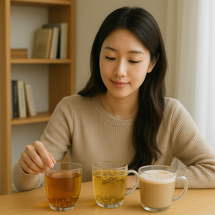 그래서 최근에는 피부과, 내과 진료실에서 커피 대신 마실 수 있는 대체 음료를 추천하는 경우가 많습니다. 카페인의 양을 줄이면서도 입이 심심하지 않게 도와주는 선택들입니다.